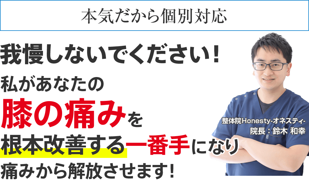 もし、あなたが上記のようなお悩みがあり、「良くなりたい!もう痛みと共に生活するのは嫌だ!」と思われているのなら整体院Honesty-オネスティ-に来院されてその辛い膝の痛みを根本から改善させませんか?