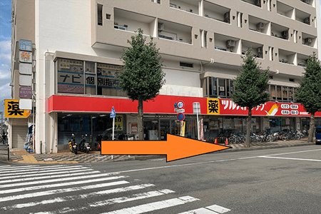 3ツルハドラッグが正面にすぐに見えるので右に曲がって直進です。